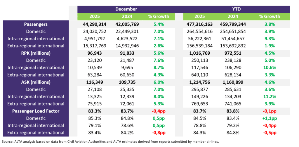 Além do desempenho por país, destaca-se a solidez estrutural da região. A ALTA reporta que os ASK (available seat kilometers) cresceram 4,6% em 2025, enquanto os RPK (revenue passenger kilometers) avançaram 4,5%. O fator de ocupação regional médio atingiu 83,7% no ano.