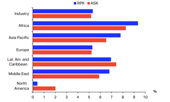 Evolução RPK vs ASK por região (2025) – Fonte: IATA Sustainability and Economics, IATA Information and Data – Monthly Statistics